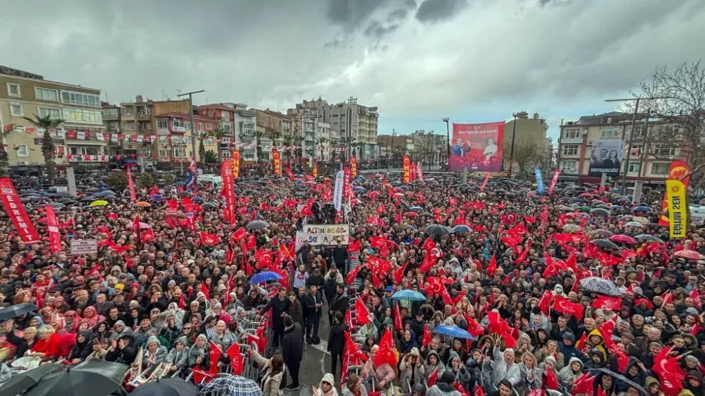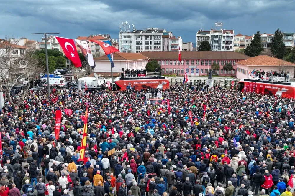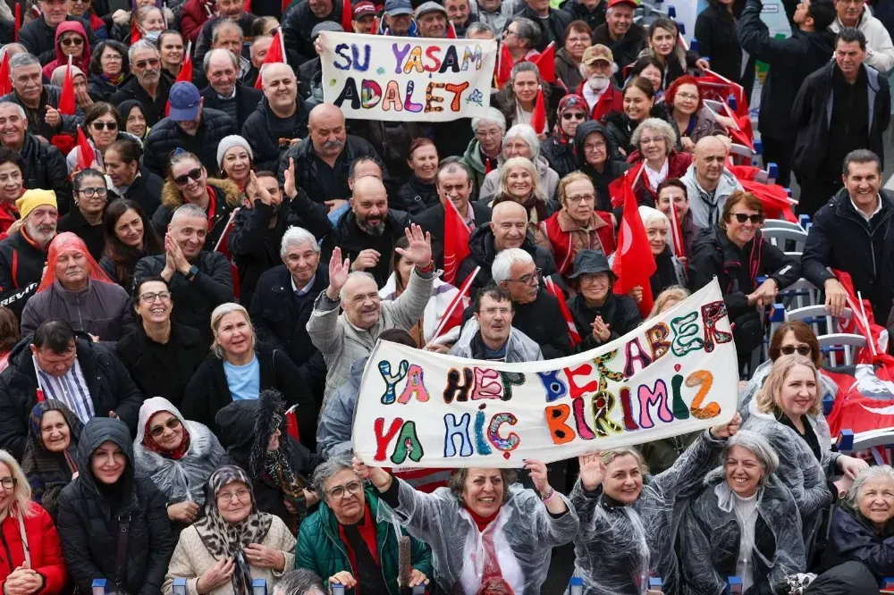 İnanın ki bu inançta olanlar, burada olanlar, bu birlikteliğe inananlar kazanacak. Haklılar kazanır. Dürüstler kazanır. Korkmayanlar kazanır. Eninde sonunda millet kazanır. Bu meydan bir evladının ismini haykırıyor. Diyorlar ki, ‘Biz milletiz. Kararı biz veririz. Kim yönetsin dersek mührü ona veririz. Ama seçtiğimizin de arkasında dimdik dururuz. Onu ne darbeciye ne de makamı ne olursa olsun demokrasinin karşısına dikilen kimseye teslim etmeyiz.’ Onun için işte bu meydan 100’üncü kez adayına sahip çıkıyor, Ekrem İmamoğlu’na sahip çıkıyor. İşte bu meydanı görmek lazım. Çanakkale’yi görmek, Çanakkale’yi duymak lazım. Bu ülkenin hiçbir evladı yalnız değildir. Hiçbir evladı sahipsiz değildir. Hasta mı var, müdahale ediliyor mu? Bu devlete bu millete hizmet eden, dirseğini çürüten, gözlük numaralarını büyüten, elleri nasırlı ama büyük bir haksızlığa uğramış bütün emeklilere bir alkış alayım. Şimdi bu ülkenin hiçbir evladı yalnız değil. Hiçbir evladı sahipsiz değil. Çanakkale’de siperden sipere koşan da bu millettir. Afyon’dan İzmir’e zafere yürüyen de bu millettir. 6 Şubat’ta enkaz başında günlerce sabahlayan, yardıma koşan da bu millettir. Soma’da, Kartalkaya’da hep birlikte yüreği yanan da bu millettir. Bugün de bizi ayakta tutacak şey; bu birlik, beraberlik ve dayanışma ruhudur. Aynı ilde, aynı bölgede yaşamak evet, ama aynı bayrağın altında yaşamak ve kardeşliği büyütmek. Türk’üyle Kürt’üyle, Alevi’siyle Sünni’siyle bu ülkede kimlik, köken, inanç ne olursa olsun bir yumruk gibi bir arada durmak, birbirine sahip çıkmak, ülkenin yarınlarına sahip çıkmak, işte o bizim işimizdir. Biz bunu başaracağız hep beraber. "MÜCADELENİN PARÇASI OLARAK KURTULACAĞIZ"